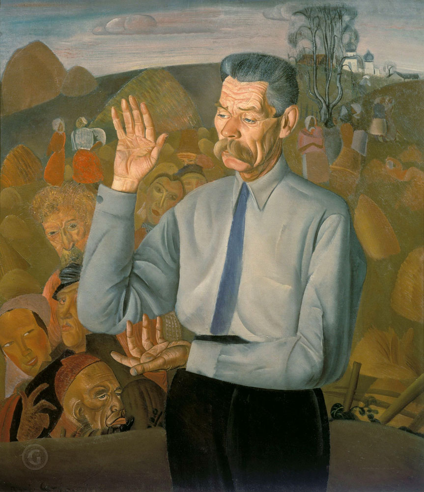 Внутренняя сила М. Горького восхищала Григорьева. Он создавал его портрет, работая с упоением, до изнеможения. В почти квадратном устойчивом пространстве холста писатель изображен в окружении героев его произведений. Горький считал эту работу лучшим своим портретом.
