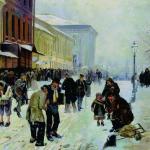 В 1893 году Маковский был избран профессором Академии художеств и в связи с этим переехал в Петербург. Целый ряд своих произведений он посвятил "новым людям", вставшим на путь борьбы с существующим строем ("Вечеринка", "Осужденный", "Оправданная", "Допрос революционерки"). Наиболее социально-эпатажные из его вещей иной раз запрещались цензурой (подобно картине "Ходынка", 1896-1901).