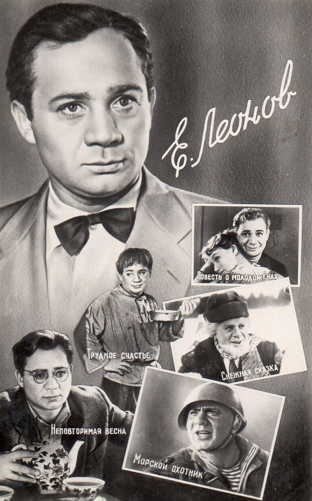 В кино Евгений Леонов сыграл первые эпизодические роли в 1949 году в фильмах режиссера Владимира Немоляева "Счастливый рейс" и "Карандаш на льду". Первые большие кинороли у Евгения Леонова появились в 1955 году: он снялся в криминальной драме Иосифа Хейфица "Дело Румянцева" и приключенческом фильме Александра Столпера "Дорога".