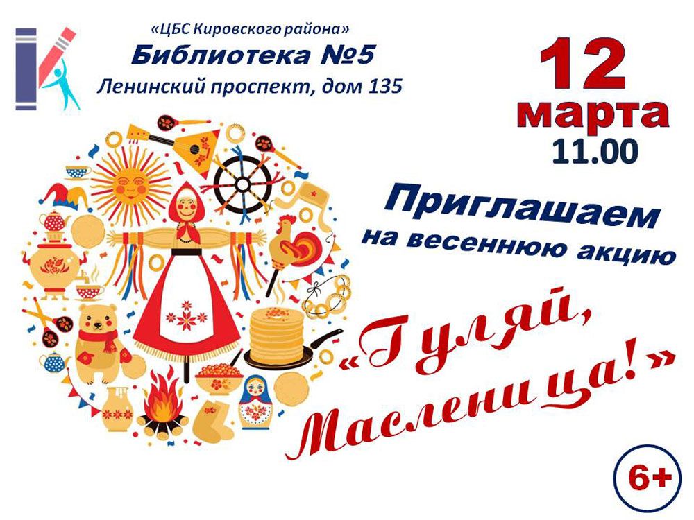 Сохраняя преемственность традиций по проводам зимы и встрече весны, в Библиотеке №5 состоится Акция "Гуляй, Масленица!".