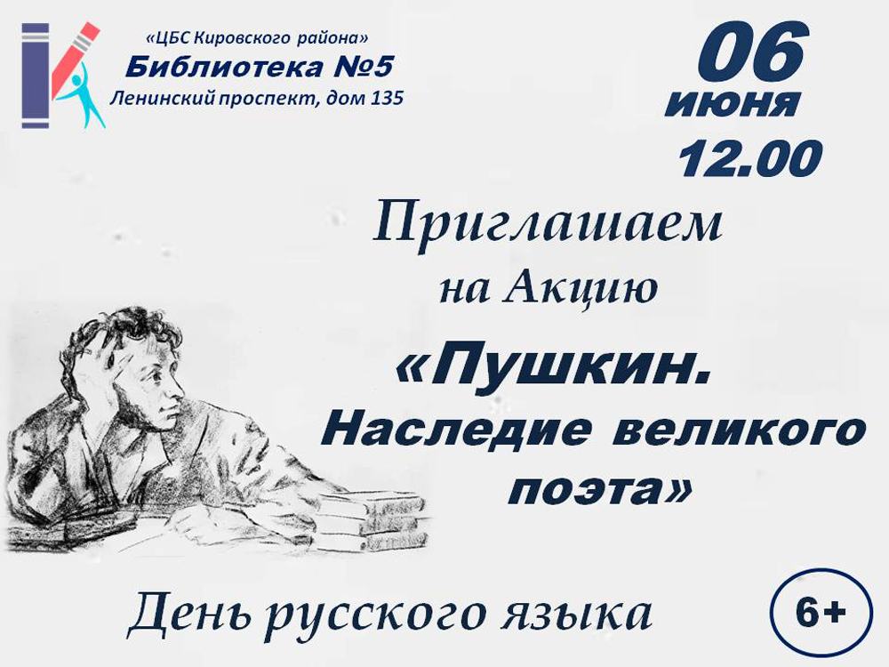 В День русского языка в Библиотеке №5 (Ленинский пр., д. 135), состоится Акция "Пушкин. Наследие великого поэта".