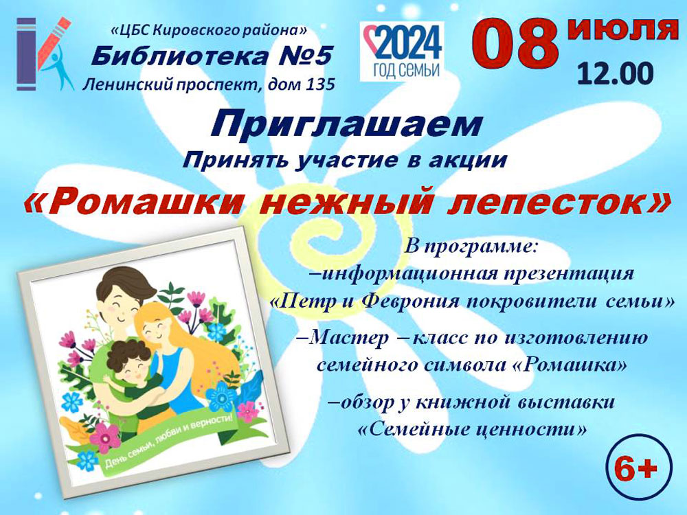 В праздничный День семьи, любви и верности в Библиотеке №5 (Ленинский пр., д. 135) состоится Акция "Ромашки нежный лепесток".