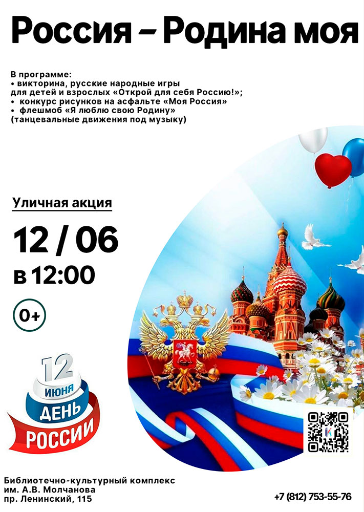 12 июня в 12.00 на Уличной площадке Библиотечно-культурного комплекса им. А. В. Молчанова (Ленинский пр., д. 115) состоится Уличная акция "Россия - Родина моя".