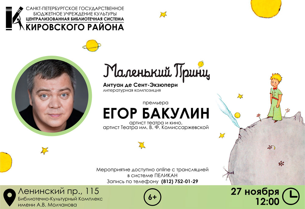 27 ноября 2023 года в 12.00 в театрально-концертном зале Библиотечно-культурного комплекса им. А. В. Молчанова (Ленинский пр., 115) состоится премьера литературной композиции по мотивам повести Антуана де Сент-Экзюпери "Маленький принц". Читает Егор Бакулин, артист театра и кино, артист Театра им. В. Ф. Комиссаржевской.