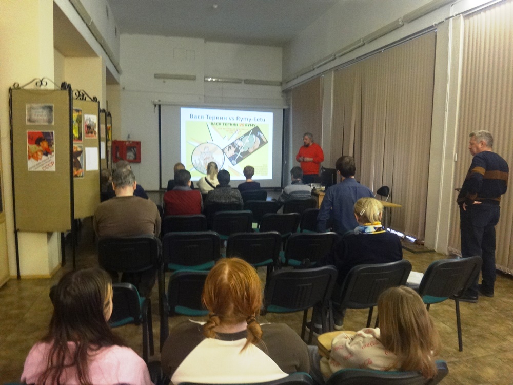 В первом выступлении сотрудник ЦРБ им. М. Шолохова Андрей Кулик рассказал о двух комиксах, герои которых находились по разные стороны фронта. Интересным фактом является то, что у советских и финских солдат были свои герои комиксов, за приключениями которых в свободное время любили наблюдать солдаты противоборствующих армий. В Красной армии на бой с рисованным врагом шел боец Вася Теркин, с финской стороны грозный Рюми Еету. Случай Теркина интересен нам, прежде всего тем, что над его созданием работали такие известные поэты как: Николай Тихонов, Самуил Маршак, Александр Твардовский и даже Сергей Михалков. Сегодня военные комиксы доносят до нас частицы реальной истории войны. В процессе рассказа Андрей Александрович рассказал о формировании образов и их авторах, а также продемонстрировал ряд совпадений и схожестей этих двух героев. Также были продемонстрированы различные примеры этих рисованных приключений.