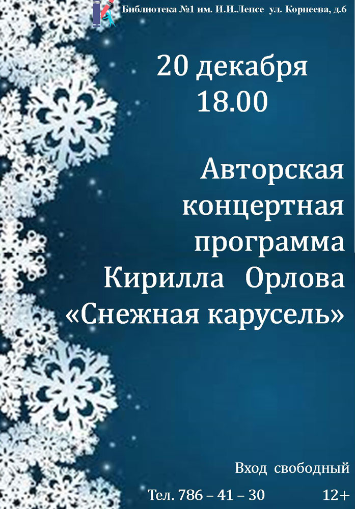 20 декабря в 18.00 в Библиотеке №1 им. И. И. Лепсе состоится Авторская концертная программа Кирилла Орлова "Снежная карусель".