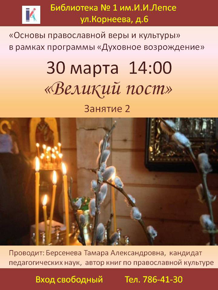 Библиотека №1 им. И. И. Лепсе приглашает на Авторскую лекцию "Великий пост" из цикла занятий "Основы православной веры и культуры", в рамках программы "Духовное возрождение".