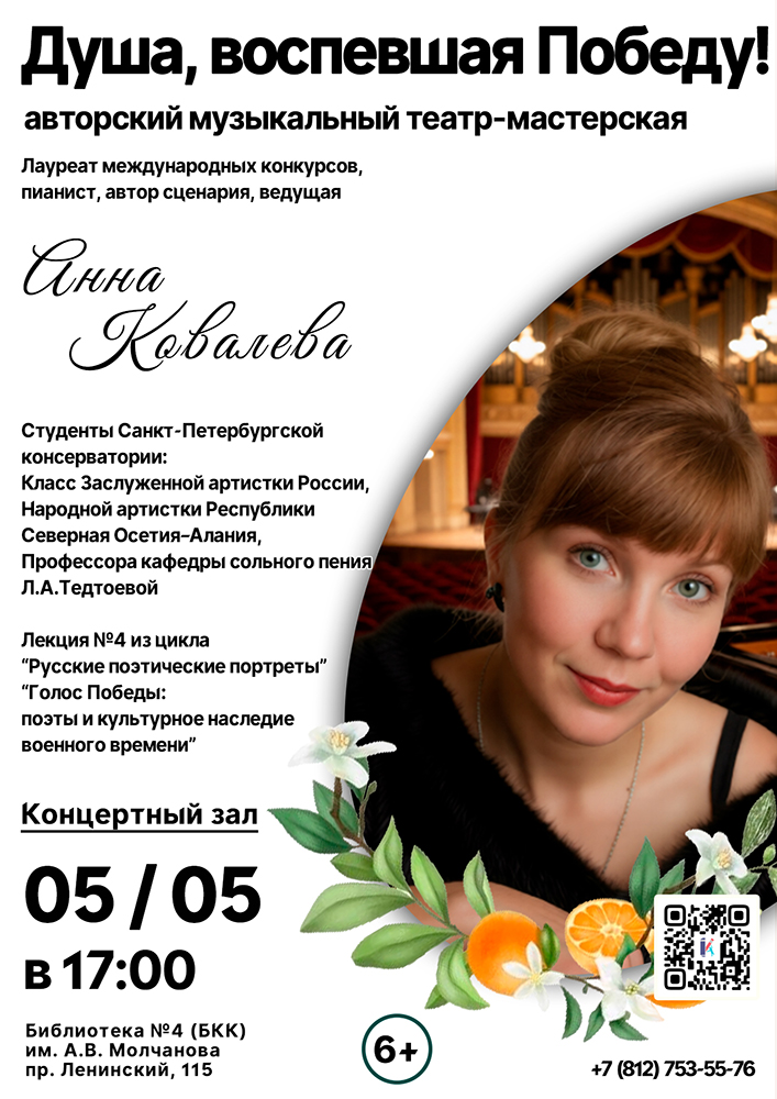 5 мая в 17.00 в концертном зале Библиотеки №4 (Библиотечно-культурного комплекса) им. А. В. Молчанова (Ленинский пр., д. 115) состоится Авторский музыкальный театр-мастерская "Душа, воспевшая Победу!".