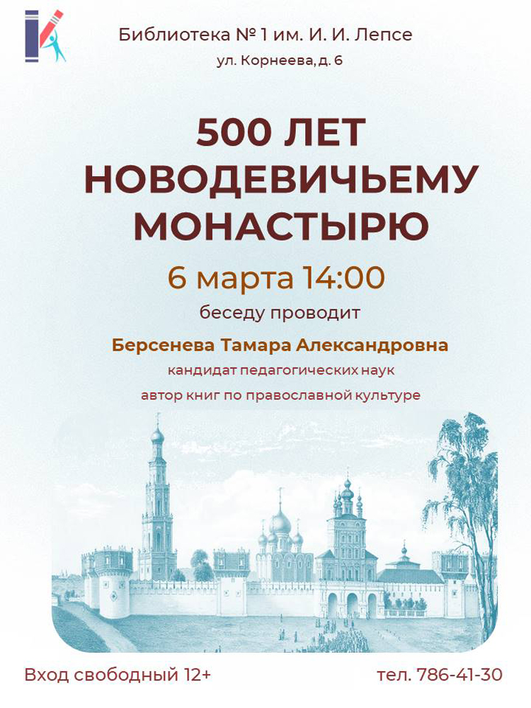 Библиотека №1 им. И. И. Лепсе приглашает на Беседу "500 лет Новодевичьему монастырю" в рамках программы "Духовное возрождение. Основы православной веры и культуры".