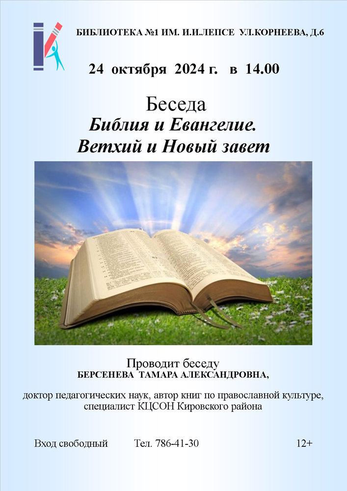 Библиотека №1 им. И. И. Лепсе приглашает на беседу "Библия и Евангелие. Ветхий и Новый завет" в рамках программы "Духовное возрождение. Основы православной веры и культуры".