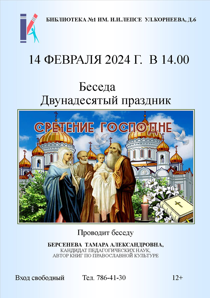 Библиотека №1 им. И. И. Лепсе приглашает на Беседу "Двунадесятый праздник. Сретение господне" в рамках программы "Духовное возрождение. Основы православной веры и культуры".