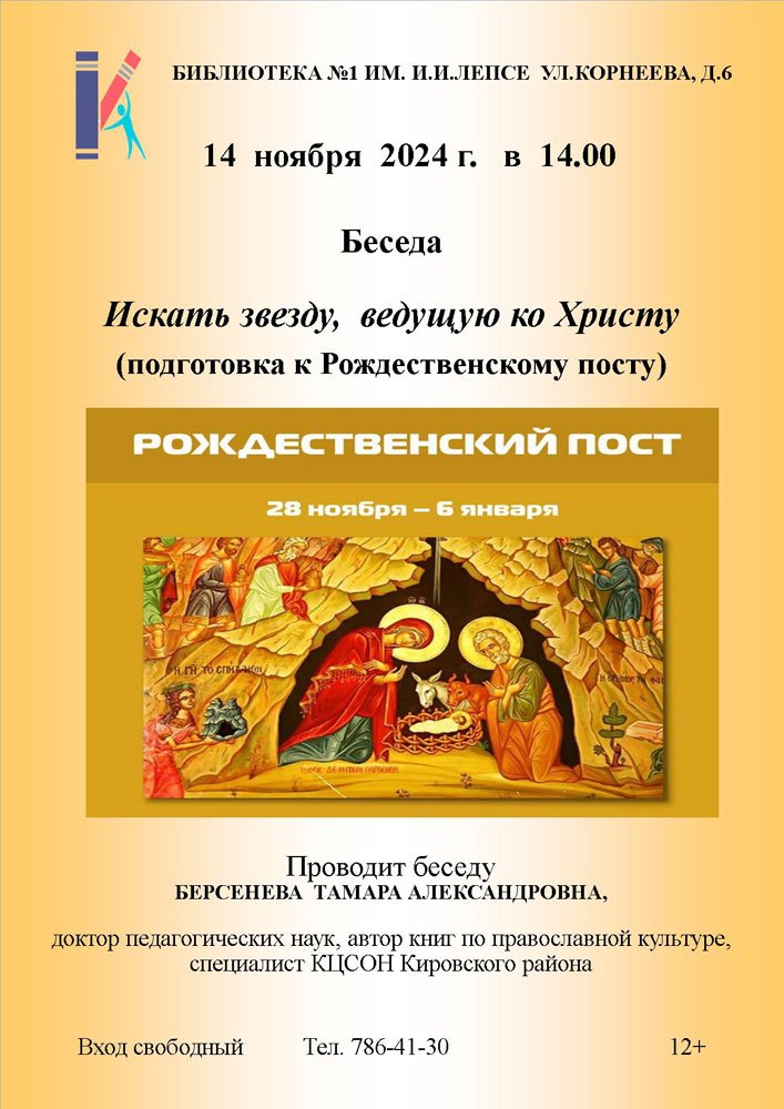 Библиотека №1 им. И. И. Лепсе приглашает на Беседу "Искать звезду, ведущую ко Христу (подготовка к Рождественскому посту)" в рамках программы "Духовное возрождение. Основы православной веры и культуры".