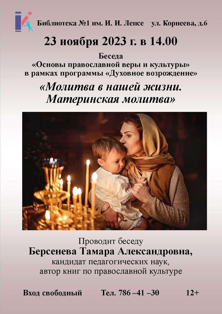 23 ноября 2023 года в 14.00 Библиотека №1 им. И. И. Лепсе приглашает на Лекцию "Молитва в нашей жизни. Материнская молитва" в рамках программы "Духовное возрождение. Основы православной веры и культуры".