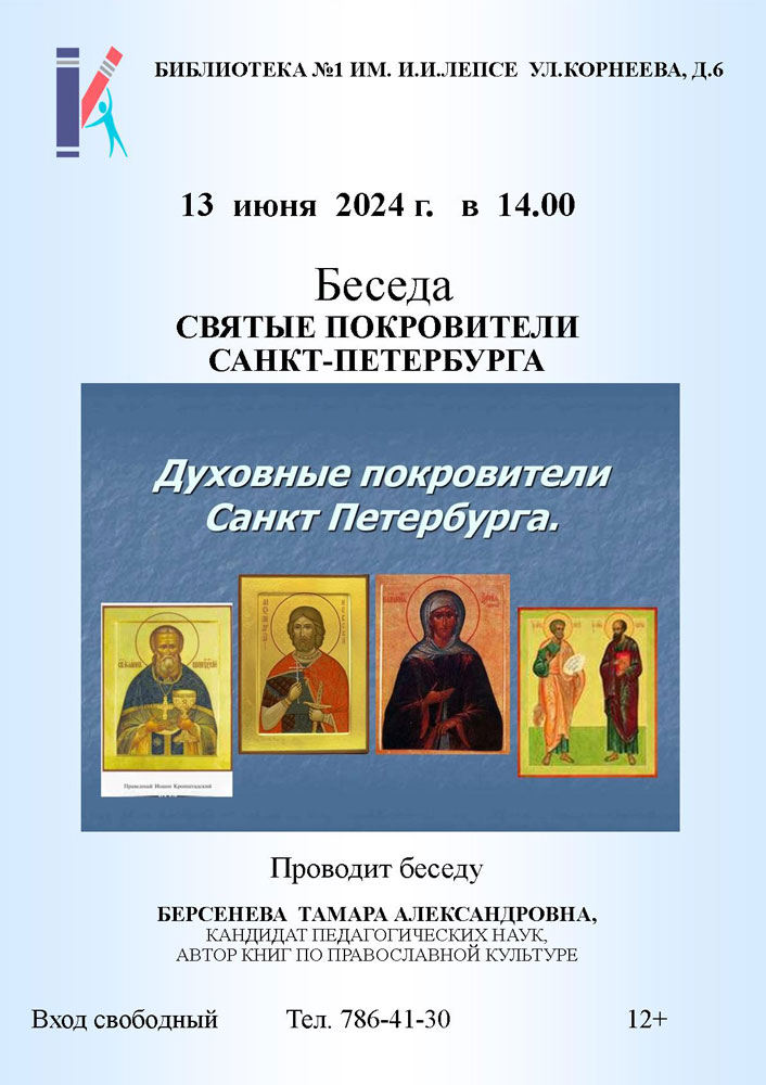 Библиотека №1 им. И. И. Лепсе приглашает на Беседу "Святые покровители Санкт-Петербурга" в рамках программы "Духовное возрождение. Основы православной веры и культуры".