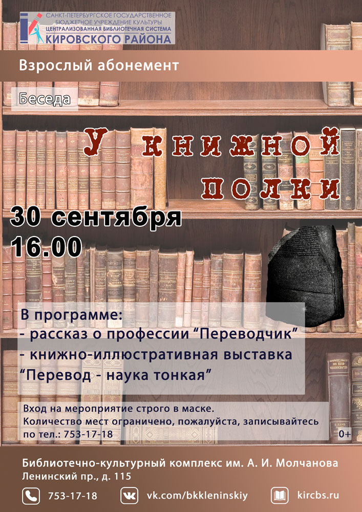 30 сентября в 16.00 в отделе обслуживания Библиотеки № 4 (Библиотечно-культурный комплекс) им. А. В. Молчанова состоится Беседа "У книжной полки", посвященная Международному дню перевода.