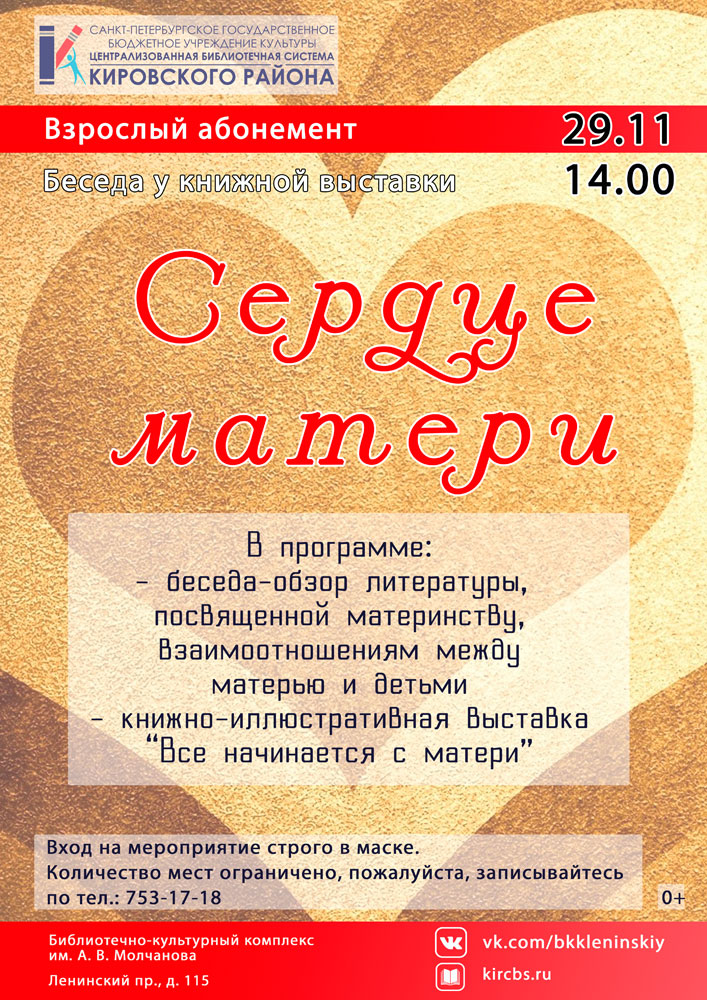 29 ноября в 14.00 в отделе обслуживания Библиотечно-культурного комплекса им. А .В. Молчанова состоится Беседа у книжной выставки "Сердце матери", посвященная Всероссийскому дню матери.