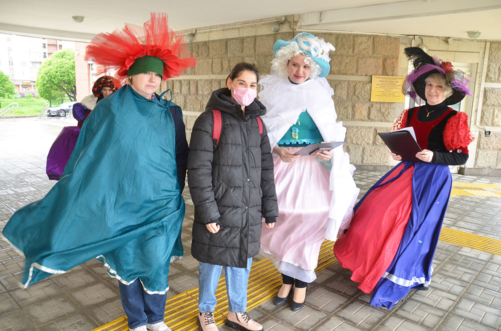 В начале Библиошоу "Этот славный книжный дом" сотрудники библиотеки в костюмах книжных героев встречали читателей на уличном дефиле "Литературный звездопад" и провожали в малый концертный зал, где были подготовлены концерт "С любовью к профессии", викторины и конкурсы "Знакомая и незнакомая библиотека".