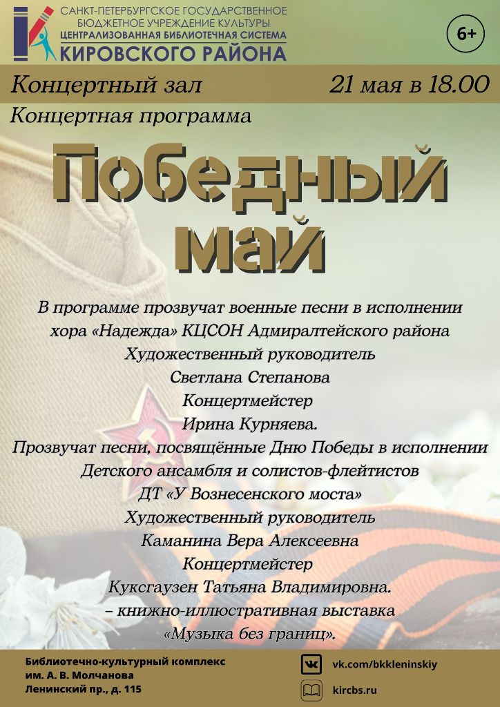 21 мая в 18.00 в Концертном зале Библиотечно-культурного комплекса им. А. В. Молчанова (Ленинский пр., д. 115) состоится Концертная программа "Победный май".