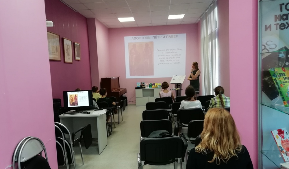 Из рассказа библиотекаря участники занятия узнали об истории возникновения праздника, традициях и обычаях, а также о том, что Святые Петр и Павел считаются небесными покровителями Петербурга. Они – одни из самых известных проповедников учения Иисуса Христа. В ходе мероприятия, с использованием мультимедийных технологий, проводилась демонстрация изображений икон первоверховных апостолов Петра и Павла, написанные иконописцем преподобным Андреем Рублевым. Дополнительная информация по теме мероприятия была представлена на книжной выставке "Святые апостолы".