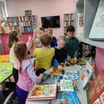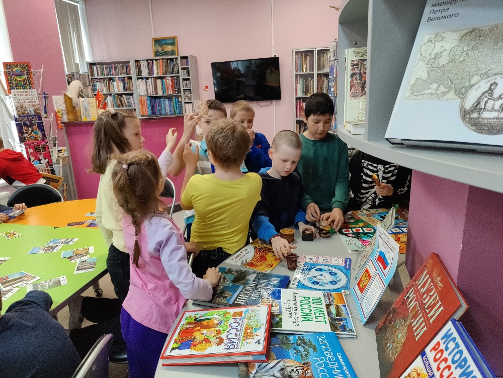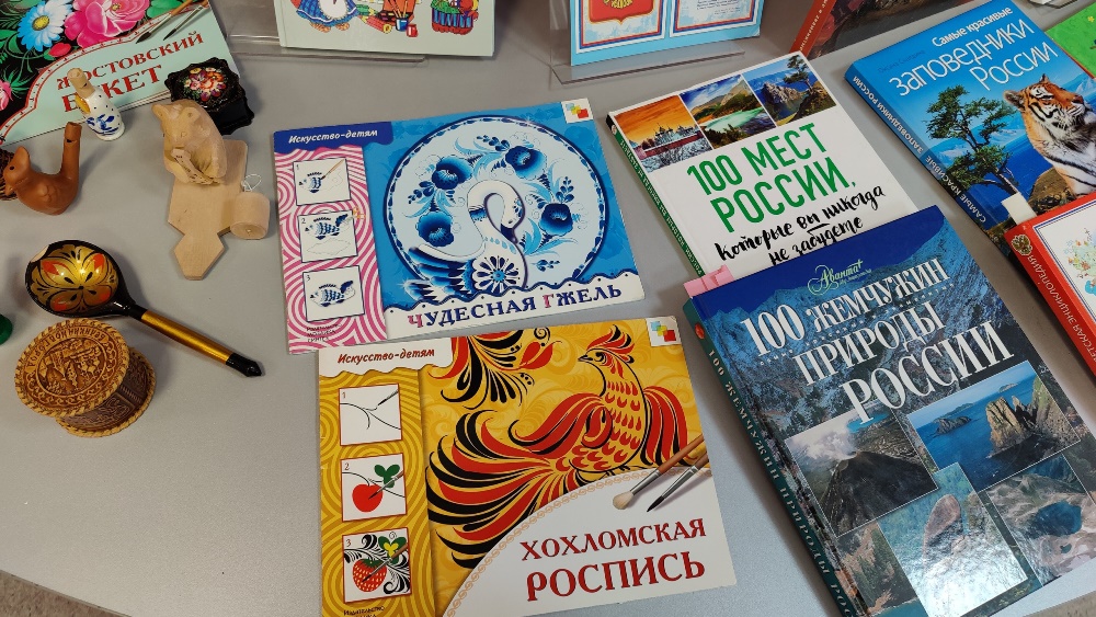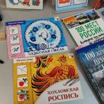 Далее участники мероприятия ответили на вопросы игры-викторины "Большая страна" и разгадали кроссворд "Промыслы России", а также знакомство с литературой, представленной на книжной выставке "Рукотворные чудеса России".