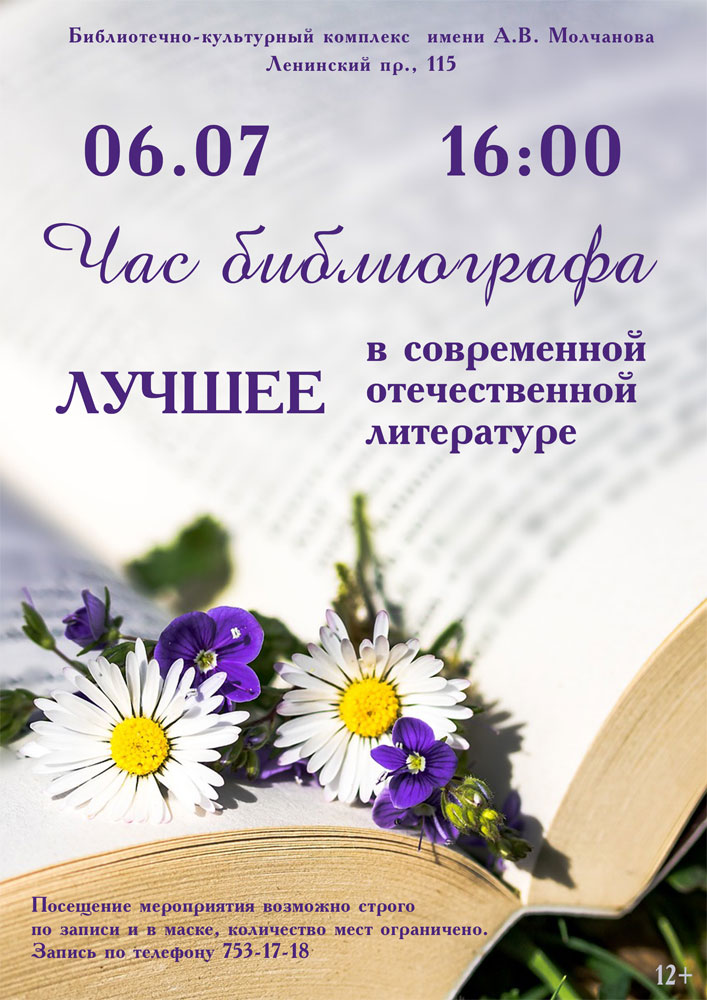 6 июля в 16.00 в отделе обслуживания Библиотеки №4 (Библиотечно-культурный комплекс) им. А. В. Молчанова пройдет Час библиографа "Лучшее в современной отечественной литературе".
