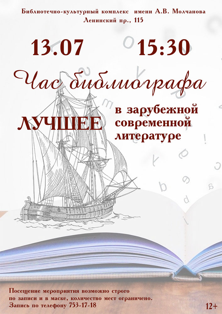 13 июля в 15.30 в отделе обслуживания Библиотеки № 4 (Библиотечно-культурный комплекс) им. А. В. Молчанова состоится Час библиографа "Лучшее в современной зарубежной художественной литературе".
