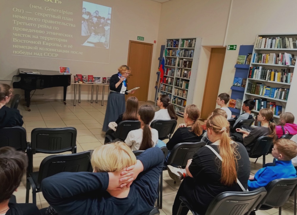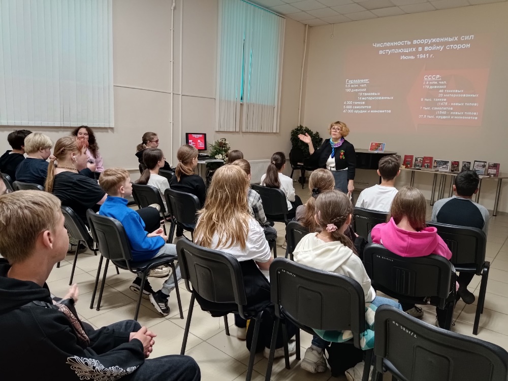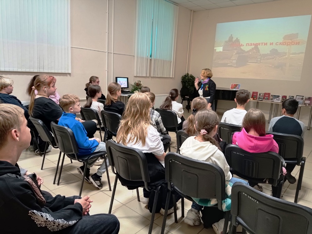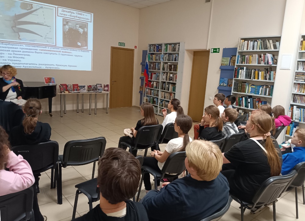 Ребята узнали о плане "Барбаросса", составленном с учетом опыта войны в Европе, который предусматривал проведение "молниеносной войны", посмотрели кадры немецкой военной кинохроники. Дети выразили свое восхищение героической обороной Брестской крепости, посмотрели фрагменты художественного и документального фильма о мужественной борьбе ее защитников. Битва под Москвой стала главным решающим сражением Великой Отечественной войны, разгром немцев под Москвой и последующее наступление Красной Армии показали несостоятельность стратегии молниеносной войны, развеяли миф о непобедимости германской армии. На встрече был показан новый видеофильм о подвиге танка Павла Гудзя, который один сражался против 18 немецких танков, подбил 10 танков в одном бою, а оставшиеся немецкие машины позорно отступили! Именно самоотверженность, героизм советских воинов остановили немцев. Битва за Москву стала переломным сражением в плане психологии: немцы узнали "русского Ивана", который не шёл в плен и отстреливался даже из горящего танка. Минута молчания завершила час Памяти, библиотека подарила летнему лагерю замечательное энциклопедическое издание о Великой Отечественной войне.