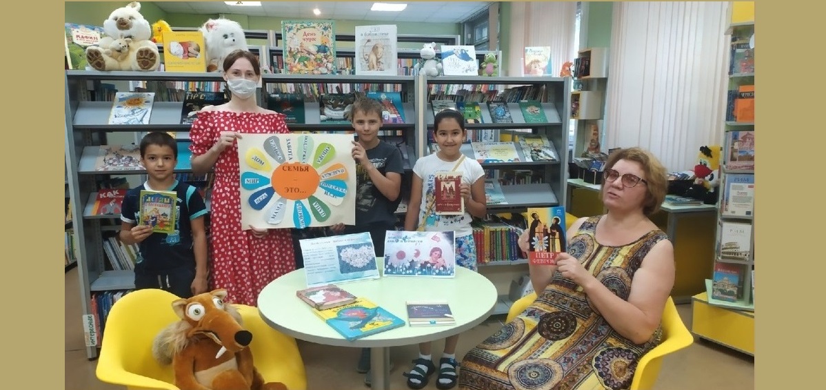 Юные читатели из информационной презентации "Сказ о Петре и Февронии" узнали о традициях праздника, о Петре и Февронии, которые стали примером семейной любви и верности, познакомились с символом праздника – ромашкой. Также дети вспомнили пословицы, поговорки и стихотворения о ромашке и семье. К празднику была подготовлена книжная выставка "Семья – это счастье, любовь и удача", где представлены книги и журналы о празднике, о роли семьи, о доверительных, добрых, уважительных отношениях в семье и о воспитании детей. Ребята просмотрели мультфильм по теме и немного рассказали о своих семьях и семейных традициях.