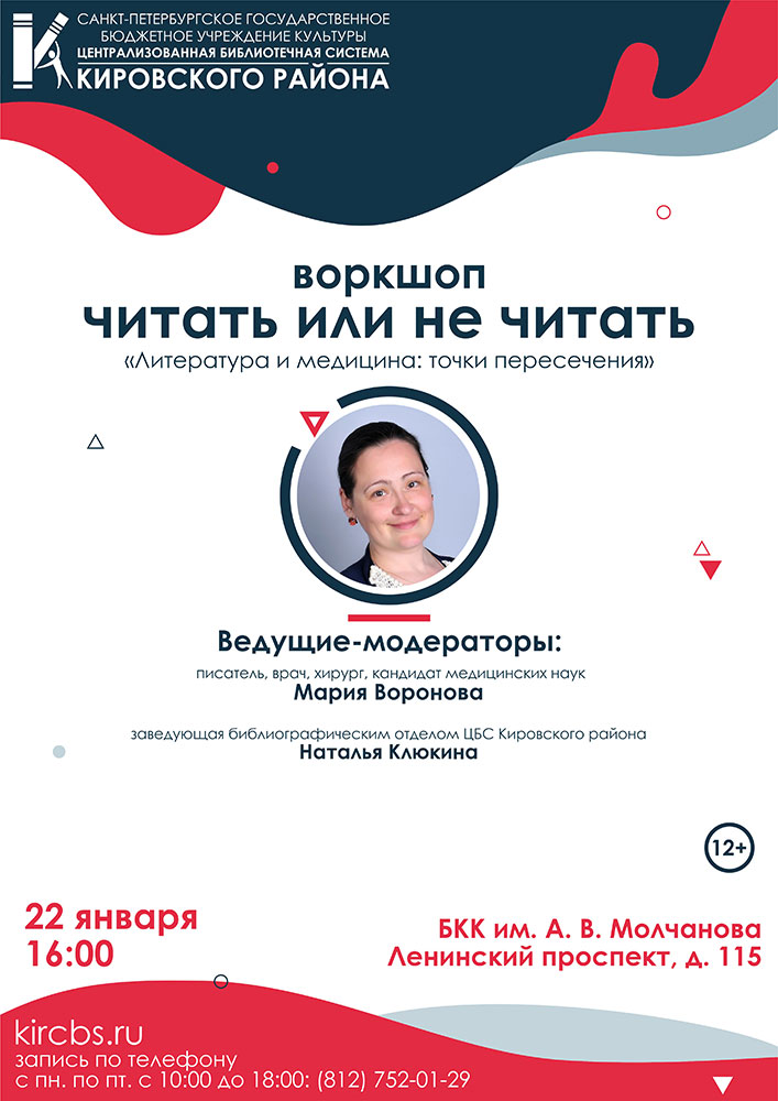 22 января в 16.00 в Библиотечно-культурном комплексе им. А. Молчанова (Ленинский пр., д. 115) состоится воркшоп "Читать или не читать" на тему "Литература и медицина: точки пересечения". Ведущими-модераторами выступят писатель, врач, хирург, кандидат медицинских наук Мария Воронова и заведующая библиографическим отделом ЦБС Кировского района Наталья Клюкина.