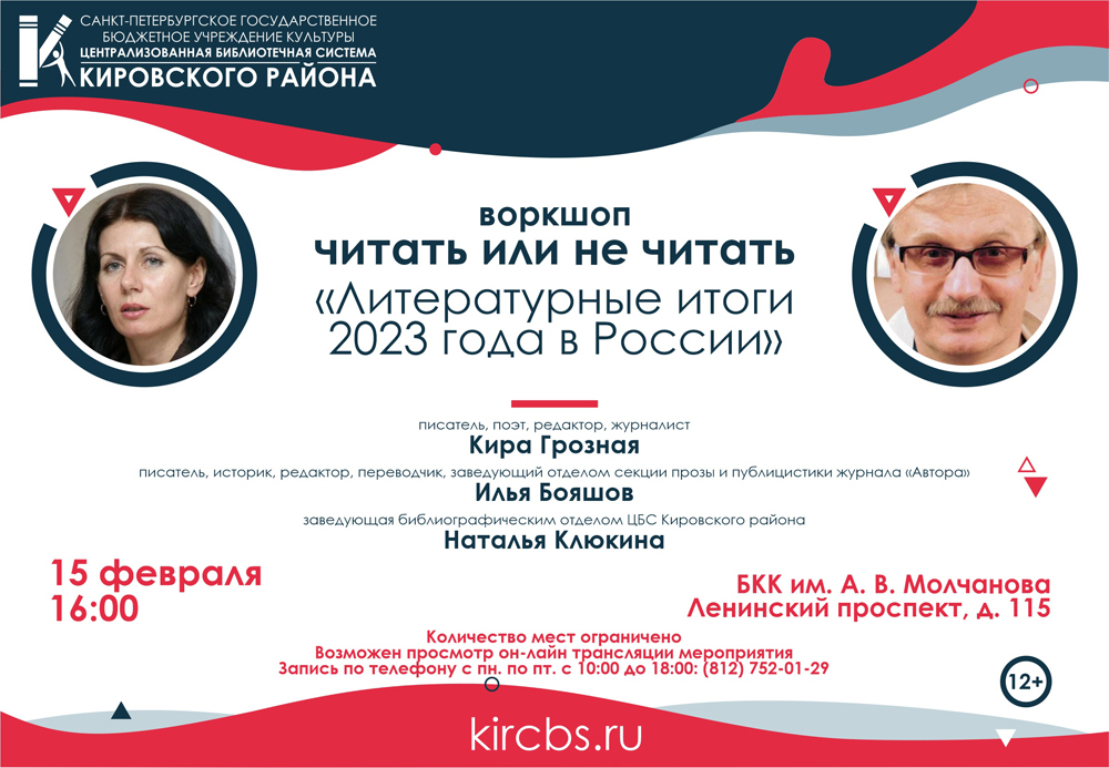 В четверг, 15 февраля, в 16.00 в Библиотечно-культурном комплексе им. А. В. Молчанова, на Ленинском пр., 115, состоится воркшоп "Читать или не читать" на тему "Литературные итоги 2023 года в России".