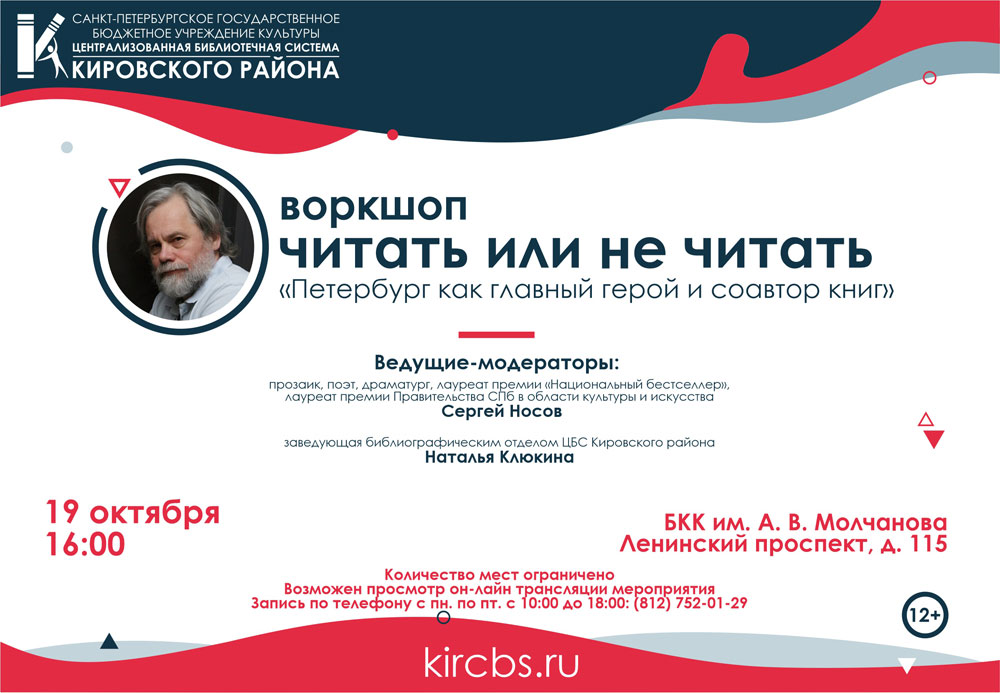 19 октября в 16.00 в Библиотечно-культурном комплексе им. А. В. Молчанова, на Ленинском пр., 115, состоится воркшоп "Читать или не читать" на тему "Петербург как главный герой и соавтор книг".