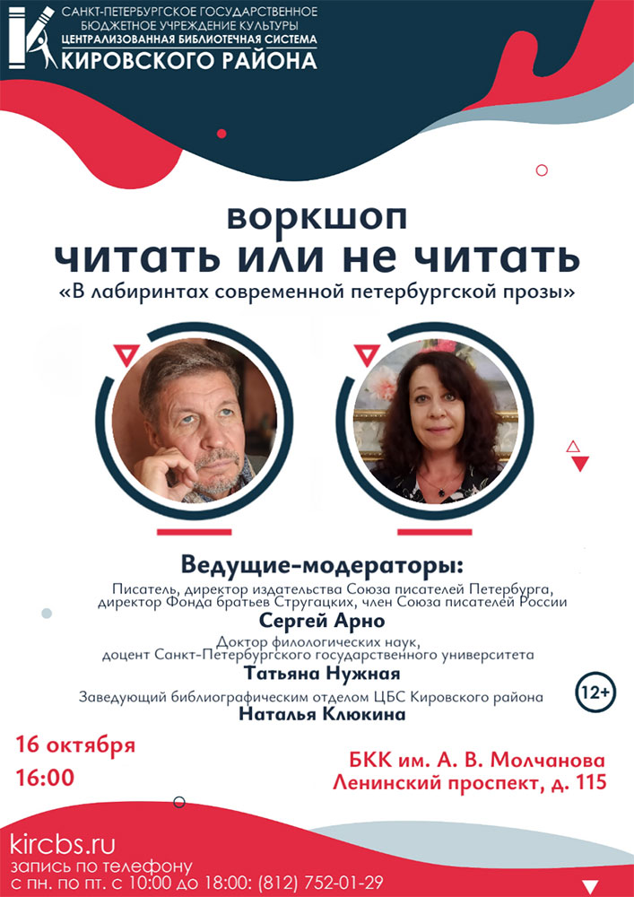 16 октября в 16.00 в Библиотечно-культурном комплексе им. А. В. Молчанова (Ленинский пр., д. 115) состоится воркшоп "Читать или не читать" на тему "В лабиринтах современной петербургской прозы". Модераторами выступят: Сергей Арно - писатель, директор издательства Союза писателей Петербурга, директор Фонда братьев Стругацких, член Союза писателей России, Татьяна Нужная - доктор филологических наук, доцент Санкт-Петербургского государственного университета и заведующая библиографическим отделом ЦБС Кировского района Наталья Клюкина.