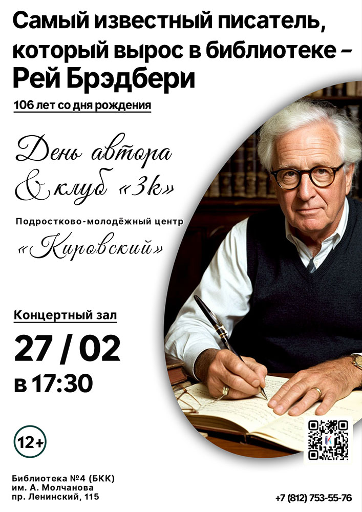 27 февраля в 17.30 в Концертном зале Библиотечно-культурного комплекса им. А. Молчанова (Ленинский пр., д. 115) состоится День автора "Самый известный писатель, который вырос в библиотеке - Рей Брэдбери".
