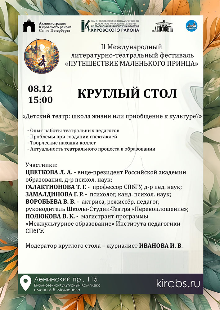 Участники круглого стола отметили, что большое количество детских театральных коллективов в наше время помогает ребятам разобраться в сложном современном мире, ответить на вопросы, волнующие подростков. Театральным педагогам был предложен интересный алгоритм выбора литературного произведения для детского театра, книги, которую стоит перенести на сцену. Интересной показалась идея создания ситуаций оптимизма в театральных постановках.