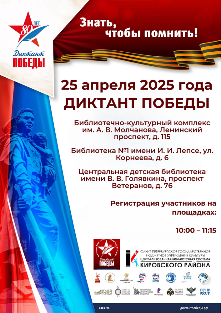 В преддверии празднования 80-ой годовщины Победы в Великой отечественной войне, 25 апреля 2025 года, библиотеки Централизованной библиотечной системы Кировского района традиционно станут площадками для проведения международного исторического диктанта на тему событий Великой отечественной войны - "Диктанта Победы".