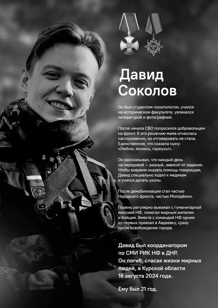 Давид Соколов, студент-политолог, учился на историческом факультете, увлекался литературой и фотографией, с начала СВО стал добровольцем. После демобилизации он вошёл в состав Народного фронта, регулярно выезжал в самые горячие точки, в том числе одним из первых - в только что освобождённую Авдеевку, помогая и бойцам, и гражданским.