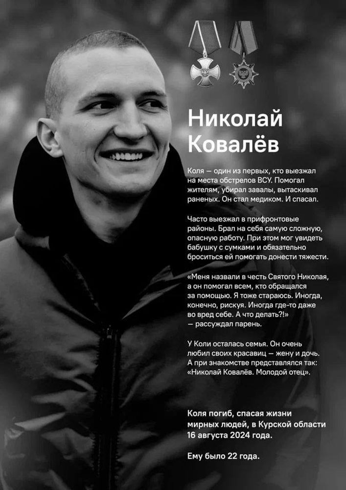 Николай Ковалев был среди тех, кто первым прибывал на места обстрелов. Он убирал завалы, эвакуировал раненых, став настоящим медиком-спасателем. Николай брал на себя самую трудную работу, проявляя мужество и самоотверженность.