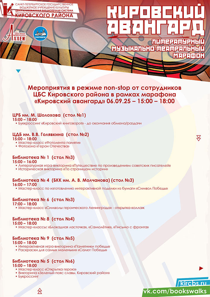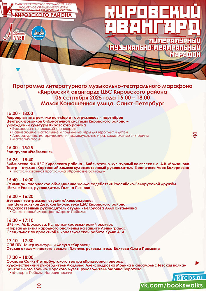6 сентября 2025 года с 15.00 до 18.00 Централизованная библиотечная система Кировского района (далее ЦБС Кировского района) и учреждения культуры Кировского района примут участие в ежегодном книжно-просветительском проекте - Фестивале "Книжные аллеи" с программой литературного музыкально-театрального марафона "Кировский авангард".