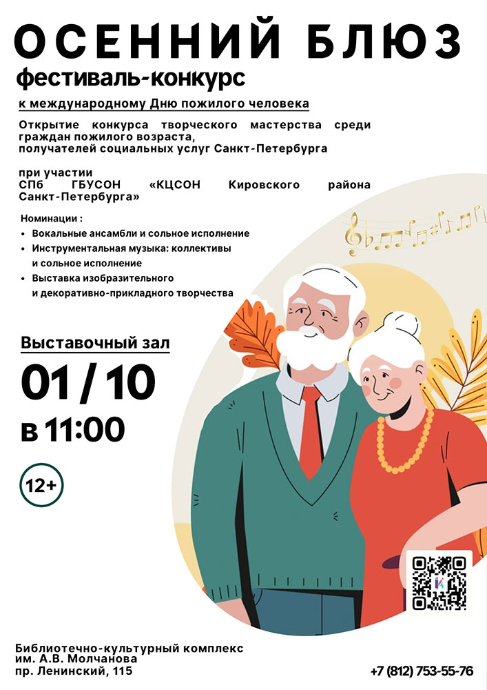 1 октября в 11.00 в Выставочном зале Библиотечно-культурного комплекса им. А. В. Молчанова (Ленинский пр., д. 115) состоится Фестиваль-конкурс "Осенний блюз", посвящённый Международному дню пожилого человека.