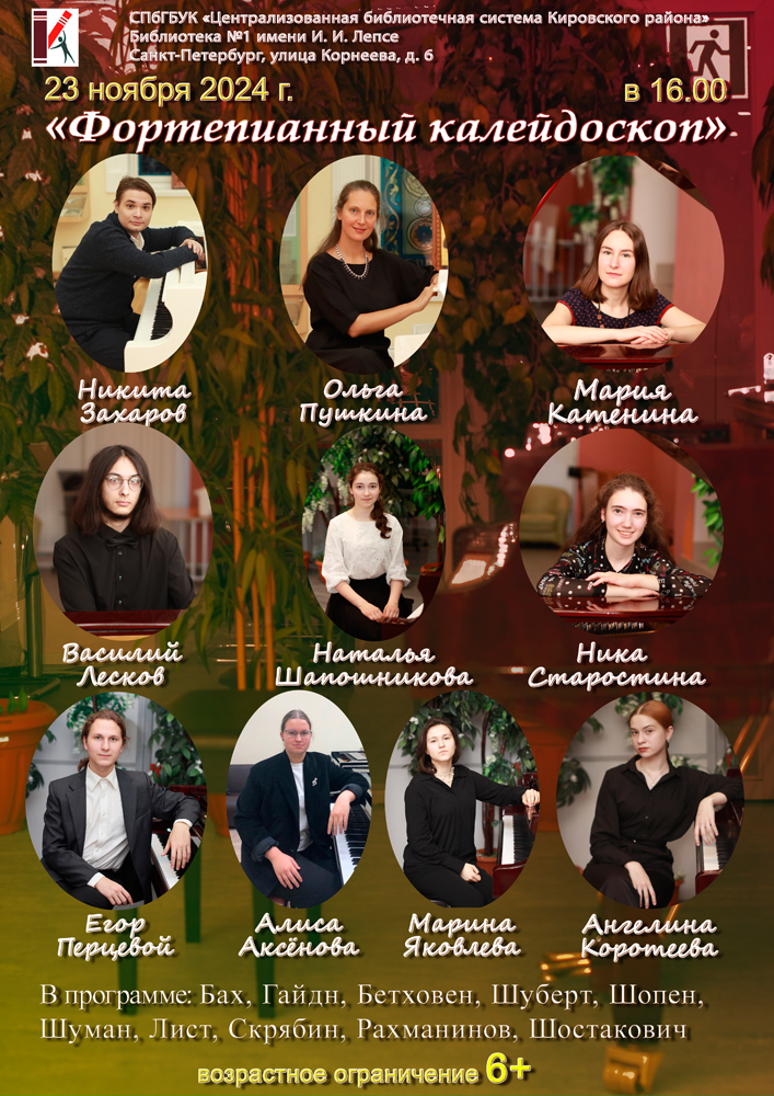 Библиотека №1 им. И. И. Лепсе приглашает на "Фортепианный калейдоскоп". В программе произведения Баха, Гайдна, Бетховена, Шуберта, Шопена, Шумана, Листа, Скрябина, Рахманинова, Шостаковича.