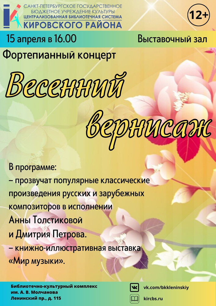 15 апреля в 16.00 в выставочном зале Библиотечно-культурного комплекса им. А. В. Молчанова состоится Фортепианный концерт "Весенний вернисаж".