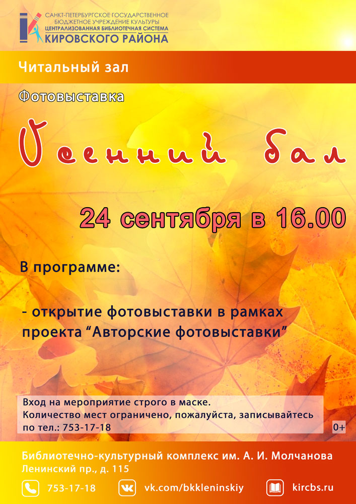 24 сентября в 16.00 в читальном зале Библиотеки №4 (Библиотечно-культурный комплекс) им. А. В. Молчанова, в рамках проекта "Авторские фотовыставки", состоится открытие фотовыставки "Осенний бал" в сопровождении тематической книжно-иллюстративной выставки из изданий библиотеки и рекомендованной литературы электронной книжной базы ЛитРес.