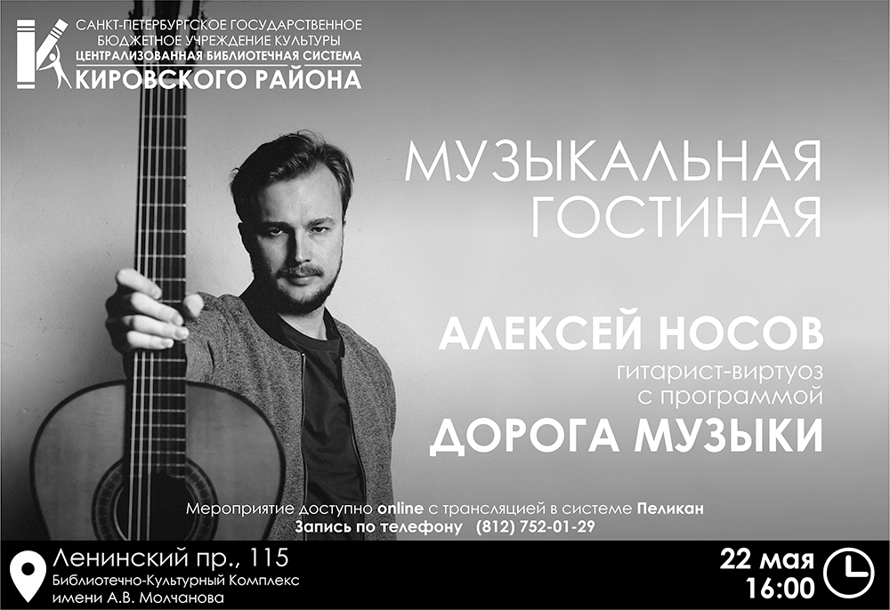 22 мая 2025 года в 16.00 в концертном зале Библиотечно-культурного комплекса им. А. В. Молчанова состоится сольный концерт гитариста-виртуоза Алексея Носова с программой "Дорога музыки" в рамках проекта "Музыкальная гостиная".