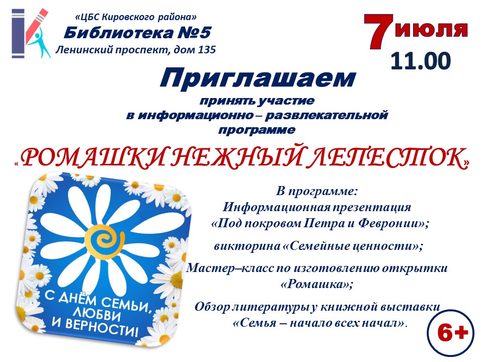 В праздничный день для каждой семьи в Библиотеке №5 (Ленинский пр., д. 135), состоится Информационно-развлекательная программа "Ромашки нежный лепесток", посвященная празднованию Дня семьи, любви и верности.