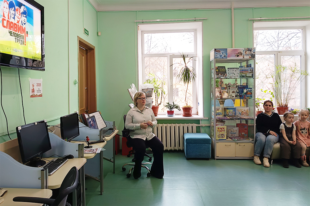 О людях труда и их делах была показана информационная презентация "Славим человека труда". Пословицы и поговорки о труде "Рыбка из пруда" позволили участникам вспомнить и закрепить тему. Желающие познакомились с книжно-иллюстративной выставкой "Не стареют душой ветераны".
