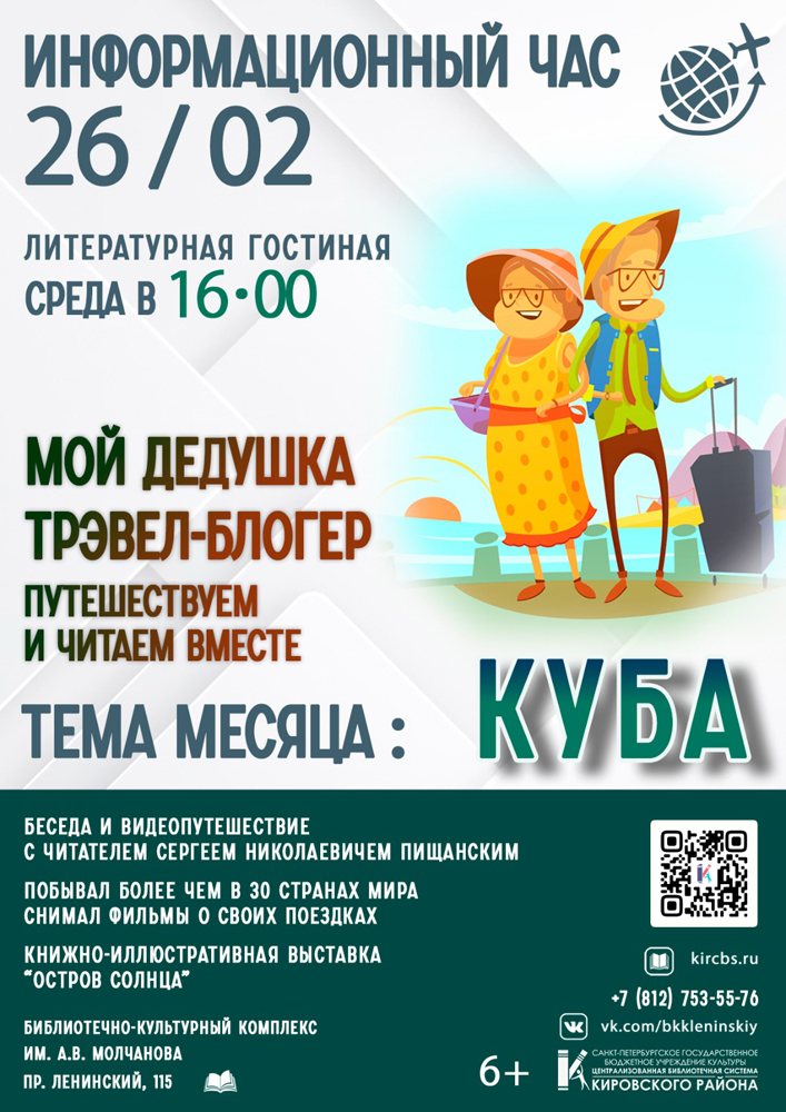26 февраля в 16.00 в Литературной гостиной Библиотечно-культурного комплекса им. А. В. Молчанова (Ленинский пр., д. 115) состоится Информационный час "Мой дедушка трэвел-блогер". В программе для гостей мероприятия состоится беседа на тему месяца: "Куба: путешествуем и читаем вместе".