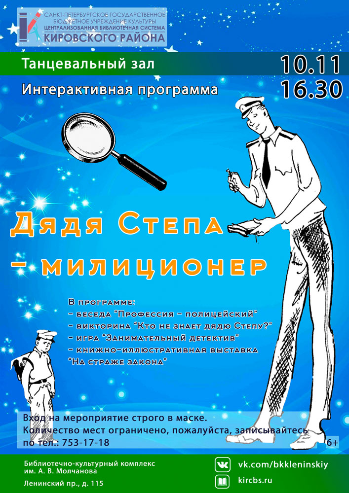 10 ноября в 16.30 в танцевальном зале Библиотечно-культурного комплекса им. А. В. Молчанова состоится Интерактивная программа "Дядя Степа - милиционер".