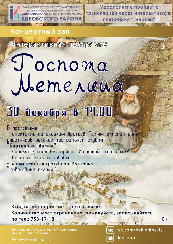 30 декабря в 14.00 в концертном зале Библиотечно-культурного комплекса им. А. В. Молчанова состоится Интерактивная программа "Госпожа Метелица".
