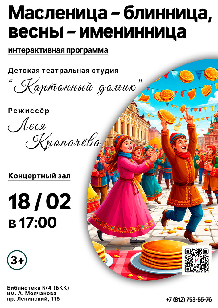 18 февраля в 17.00 в Концертном зале Библиотечно-культурного комплекса им. А. Молчанова (Ленинский пр., д. 115) состоится Интерактивная программа "Масленица - блинница, весны именинница".