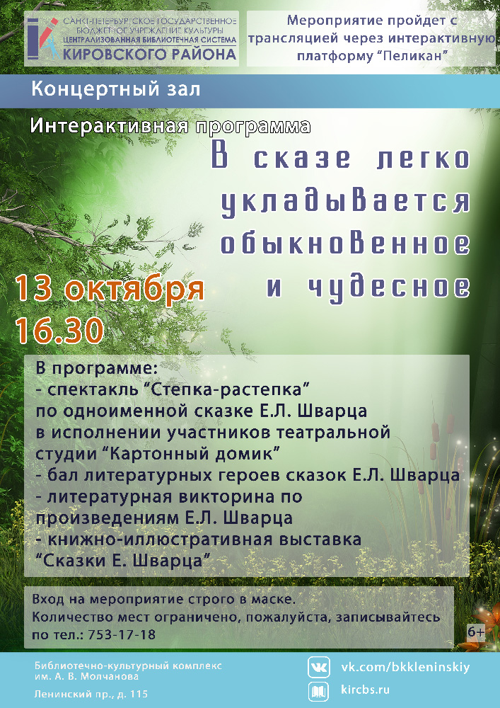 13 октября в 16.30 в концертном зале Библиотеки №4 (Библиотечно-культурный комплекс) им. А. В. Молчанова состоится Интерактивная программа "В сказе легко укладывается обыкновенное и чудесное", посвященная 125-летию со дня рождения Е. Л. Шварца.